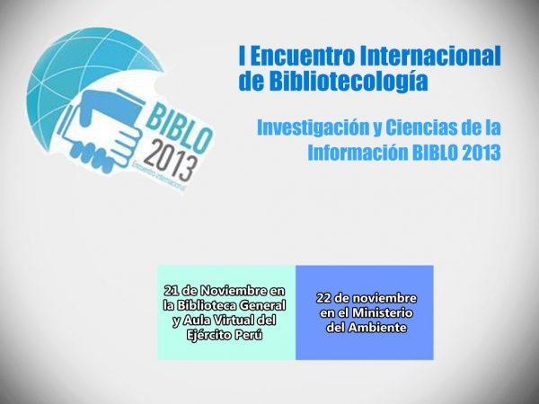El desarrollo de BIBLO 2013 se realizará los días 21 y 22 de noviembre en la Biblioteca General y Aula Virtual del Ejército Perú y el Ministerio del Ambiente, respectivamente. Se contará con la presencia de distinguidos ponentes de Chile, Colombia, Brasil y Perú.