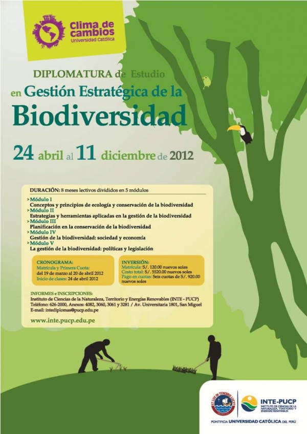 La primera de ellas es en Gestión Estratégica de la Biodiversidad y tiene como objetivo preparar al participante para su desempeño en la gestión de la biodiversidad y familiarizarlo con el manejo de herramientas conceptuales y metodológicas aplicables a este campo. Del mismo, modo busca que el participante desarrolle una visión global sobre la gestión de la biodiversidad y el manejo de los recursos naturales que le permita elaborar propuestas sostenibles al respecto.