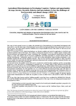 Biotechnology-assisted crop genetic improvement for food security and sustainable agriculture: perspectives for the Latin American and Caribbean Region, así como Biosafety regulations and perspectives at the Latin America and the Caribbean Region: Status, needs and actions son documentos preparados para la sesión paralela para Latinoamérica y el Caribe de la conferencia Agricultural Biotechnologies in Developing Countries: Options and opportunities in crops, forestry, livestock, fisheries and agro-industry to face the challenges of food insecurity and climate change (ABDC-10).