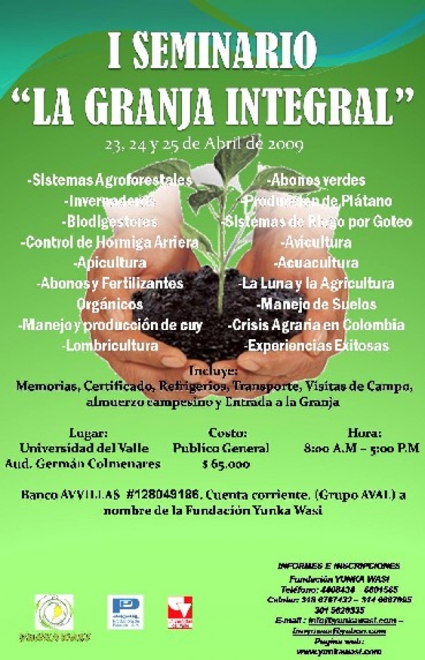 Los días 23, 24 y 25 de abril de 2009, se llevará a cabo el Seminario "La granja integral", en la Universidad del Valle, Auditorio Germán Colmenares, Cali, Colombia. Este seminario busca socializar varios conocimientos y mostrar varias experiencias exitosas faciles de reproducir.