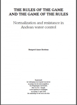 This book is about the power of water as much as about the power of water ontologies and water identities, and about the power of the Water Lords’ policy and expert communities, those who are legitimized and endorsed to define and construct ‘the others’ and their problems. Naming and norming, and the legally or scientifically awarded faculty to put water things and users in their place, are basic to the global and Andean water power games, particularly whenever such names, norms, and network positions and relations are accepted as ‘natural’ or ‘inevitable’: when they become ingrained in everyday water control relations and people internalize not just the names but also their corresponding norms and positions. What is the norm, who is normal (who is abnormal), and what is the normal behavior of water rights and users in water control networks and practices? Throughout Andean history, the authority to define and categorize ‘others’, their positions, properties and property rules, has directly reflected the images and societies of the Definers themselves, their positions, properties and property rules, and the interests they have in naming, norming and mastering these others and their properties. In today’s modern society, apparently, the most subtle and ingenious namers, normers and network-builders stand the best chances to materialize their interests – particularly if the norms that are adopted do not seem to be theirs but ‘locally or self-fabricated’.
