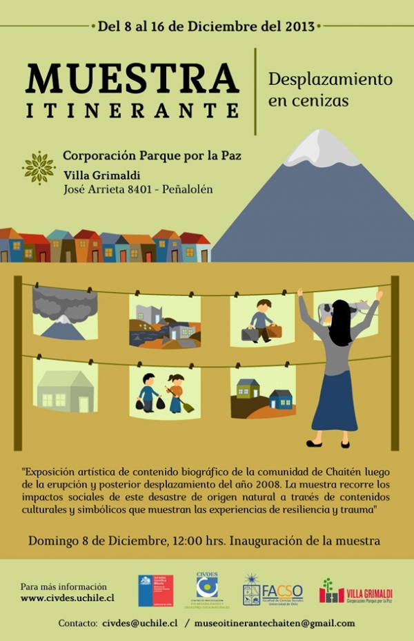 Desde el 8 al 16 de Diciembre de 2013 tendrá lugar la muestra itinerante “Desplazamiento en cenizas” basada en una exposición artística de contenido biográfico de la comunidad de Chaitén luego de la erupción y posterior desplazamiento del año 2008.