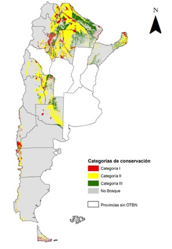La Ley de Presupuestos Mínimos de Protección Ambiental a los Bosques Nativos (conocida como Ley de Bosques) establece tres categorías para zonificar el bosque. De acuerdo a la legislación nacional, no se permite desmontar las categorías I (marcadas con rojo) y II (con amarillo).