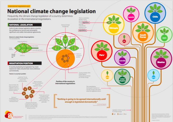 CDKN has launched a new infographic, National climate change legislation, that illustrates the connections between countries’ domestic laws on climate change and their ambition in global climate talks. The infographic is for the widespread use of communicators in the run-up to critical UN climate talks in Peru this year (December 2014) and in France in 2015, when a new global deal is due to be struck.