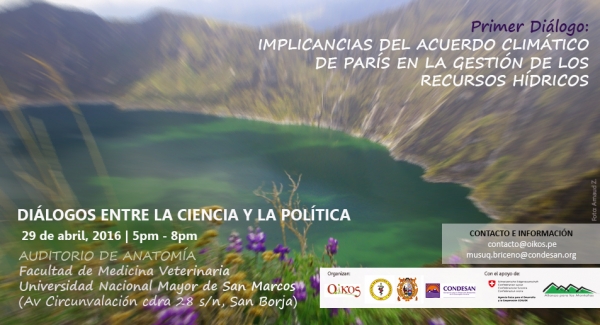 The first dialogue of the series is called: "Implications of the Paris Climate Change Agreement (COP21) in the management of water resources", and will be held on 29 April at 5pm in Auditorio Anatomía - Facultad de Medicina Veterinaria, Universidad Nacional Mayor de San Marcos, in Lima, Peru.