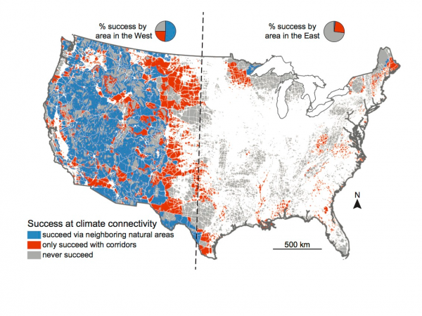 The situation is even more dire in the eastern US: only 2% of natural lands provide the kind of connectivity needed for species to flee, compared to 51% in the west. Not only is the east more densely urbanized, but it also has less of a climate gradient due to smaller, older mountains. The west, in contrast, has much taller mountains (providing a bigger climate gradient) and much bigger swaths of untouched wilderness.