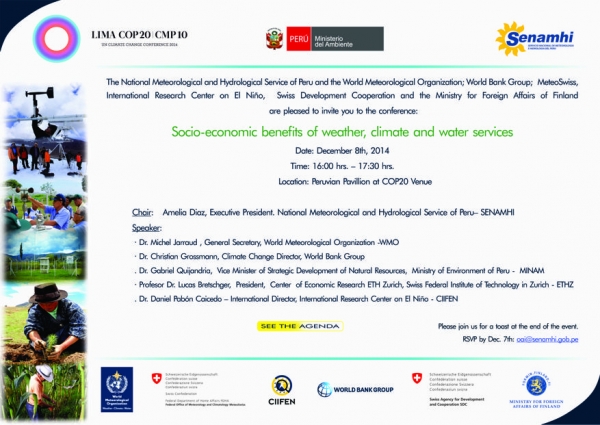 The National Meteorological and Hydrological Service of Peru and the World Meteorological Organization; World Bank Group; MeteoSwiss, International Research Center on El Niño, Swiss Development Cooperqtion and the Ministry for Foreign Affairs of Finland are pleased to invite you to the conference :