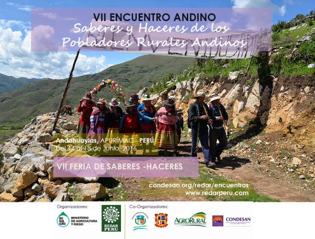 Este encuentro, es organizado por REDAR PERÚ y por el Ministerio de Agricultura del Perú. Como co-organizadores participan AGRORURAL y CONDESAN, contando con el auspicio del Gobierno Regional de Apurímac y de los municipios locales de Andahuaylas y Chincheros. CONDESAN lo apoya a través de su Programa de Montañas, que busca, entre sus objetivos, difundir información y facilitar intercambios de conocimientos entre actores clave del desarrollo sostenible de las montañas.