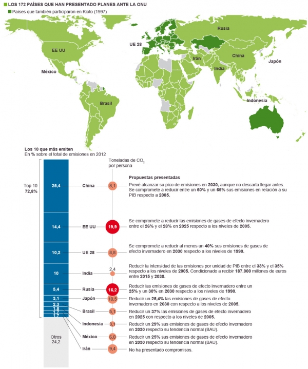 El tratado no impondrá metas individuales de reducción de CO2. Para intentar no repetir Kioto, con un alcance muy limitado, se ha optado por otra fórmula: que cada país voluntariamente presente compromisos de reducción de emisiones, tanto los desarrollados como los que no lo son. A unos días del inicio de la cumbre, más de 170 lo han hecho. Entre ellos figuran todas las principales potencias económicas del mundo.