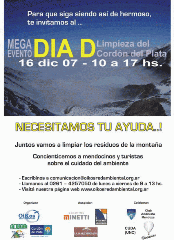 OIKOS, organización de la sociedad civil que trabaja por los derechos ambientales, está organizando el evento DIA D: Limpieza del Cordón de la Plata en Mendoza - Argentina, cuyo objetivo es crear conciencia del cuidado del medio ambiente y limpiar la basura depositada en la zona comprendida de Vallecitos hasta el Refugio San Antonio.