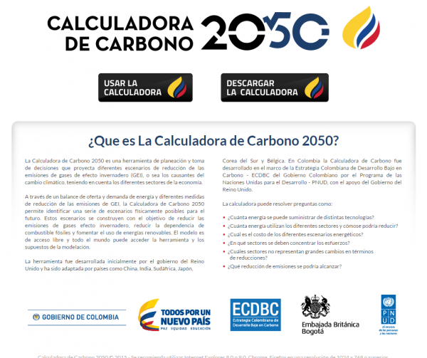 Esta Calculadora de Carbono es una herramienta Web de planeación y toma de decisiones desarrollada en el marco de la “Estrategia Colombiana de Desarrollo Bajo en Carbono” que permitirá proyectar escenarios de reducción de las emisiones de gases de efecto invernadero (GEI), teniendo en cuenta los diferentes sectores de la economía hasta el año 2050.