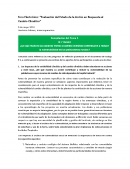 Compilación del Tema 1 (3-7 mayo): ¿De qué manera las acciones frente al cambio climático contribuyen a reducir la vulnerabilidad de las poblaciones rurales? es una síntesis de los aportes de los participantes, tomando como referencia las tres preguntas de reflexión planteadas en el documento de trabajo # 1.