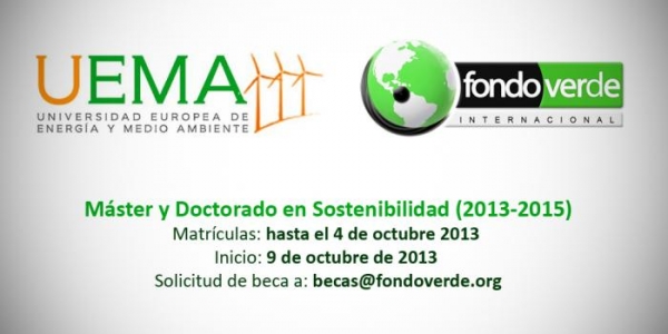 La Universidad Europea de Energía y Medio Ambiente (UEMA) está organizando un programa de Máster y Doctorado en Sostenibilidad, que se desarrollará de manera virtual. Este programa iniciará el 9 de octubre del 2013 y la matrícula va hasta el 4 de octubre.
