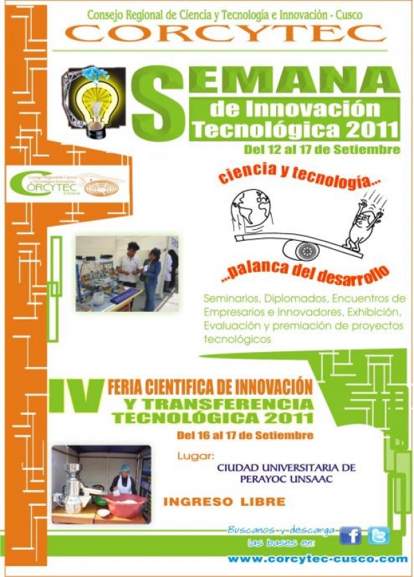 Con el fin de promover el desarrollo y la cultura de la innovación se realizará, por primera vez, la I Semana Regional de la Innovación en la ciudad de Cusco, en Perú del 13 al 17 de septiembre. Este evento tiene como objetivo principal contribuir a mejorar la competitividad regional mediante la articulación de la oferta tecnológica con las demandas en los sectores empresariales, especialmente los vinculados a la agroindustria, metalmecánica y artesanía.