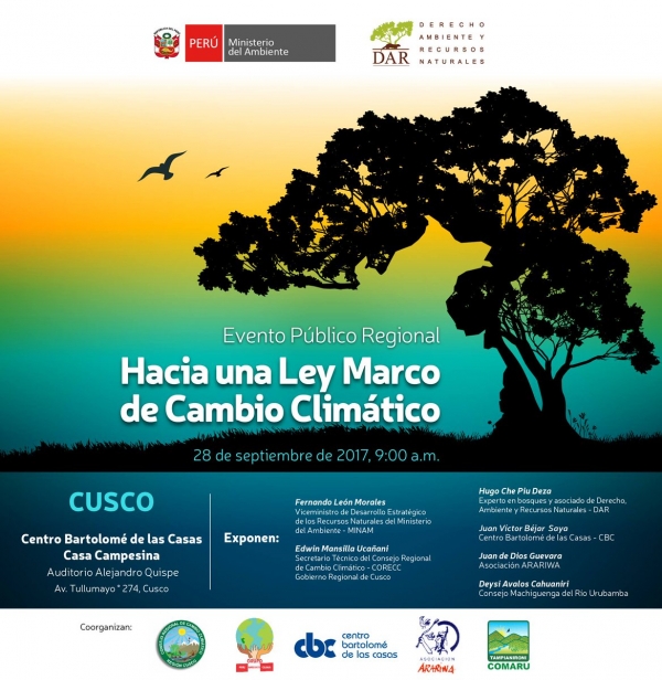 El Ministerio del Ambiente del Perú (Minam) y la Asociación Civil Derecho, Ambiente y Recursos Naturales (Dar) llevarán a cabo hoy, 28 de setiembre, en Cusco el Evento Público denominado “Hacia una Ley Marco de Cambio Climático en el Perú”, donde representantes de la sociedad civil, organizaciones sociales e instituciones públicas de esta zona del país conocerán la propuesta normativa e intercambiarán opiniones sobre la importancia de contar con una Ley Marco de Cambio Climático.