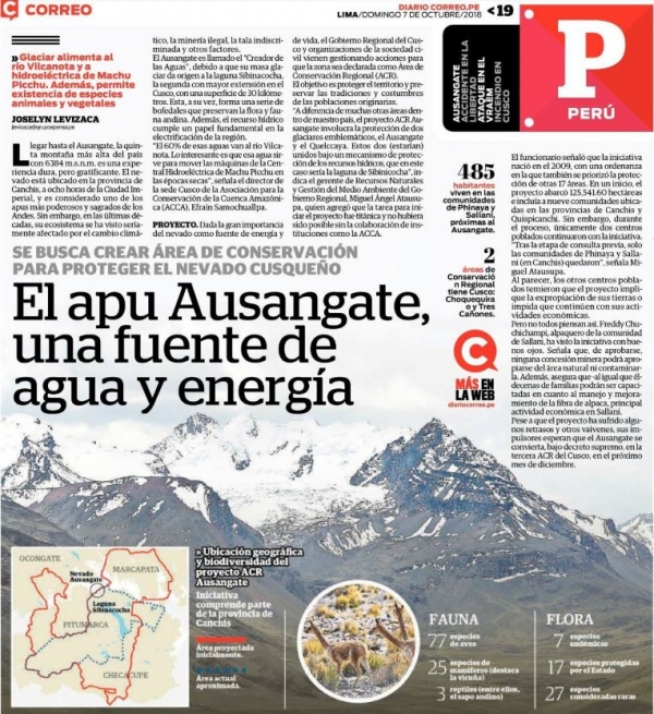 “A diferencia de muchas otras áreas dentro de nuestro país, el proyecto ACR Ausangate involucra la protección de dos glaciares emblemáticos, el Ausangate y el Quelccaya. Estos dos (estarían) unidos bajo un mecanismo de protección de los recursos hídricos, que en este caso sería la laguna de Sibinicocha”, indica el gerente de Recursos Naturales y Gestión del Medio Ambiente del Gobierno Regional, Miguel Ángel Atausupa.