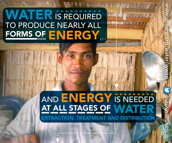 Se precisa agua para generar prácticamente cualquier tipo de energía y se necesita energía en todas y cada una de las fases de producción de agua. El informe WWDR2014, que se publicará el 21 de marzo de 2014 durante las celebraciones oficiales del Día Mundial del Agua en Tokio, Japón, describe las interrelaciones entre el agua y la energía así como las limitaciones, los retos, los impactos y las oportunidades de dicha relación. El informe también ofrece ejemplos de acciones y respuestas que pueden dar lugar a unos resultados mutuamente beneficiosos y ofrece los datos más recientes sobre el crecimiento esperado en la demanda de agua y energía.
