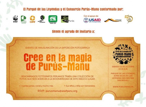 Están cordialmente invitados a la inauguración de la Exposición fotográfica de la campaña "Cree en la magia de Purús-Manu. Pura Amazonía", que se realizará este sábado 11 de octubre a las 10.30 a.m. en el Parque de las Leyendas de Lima.