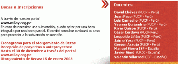 El Grupo de Telecomunicaciones Rurales de la Pontificia Universidad Católica del Perú e Ingeniería Sin Fronteras está organizando el I curso y encuentro latinoamericano de redes inalámbricas para zonas rurales, iniciativa del Programa Willay para el apoyo a la gobernabilidad local a través de la difusión de soluciones de Tecnologías de Información y Comunicación (TIC) para zonas rurales.