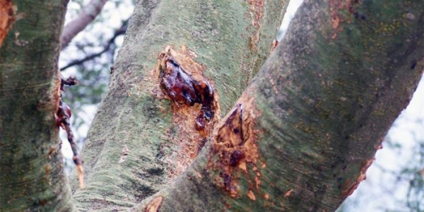 El tronco y las principales ramas del árbol, ante heridas accidentales o provocadas, presentan la particularidad de producir el exudado de una sustancia gomosa. Un árbol adulto puede secretar entre 100 y 300 gramos de goma al año.