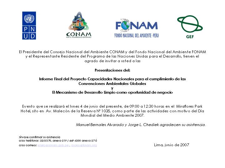 El Presidente del Consejo Nacional del Ambiente CONAM y del Fondo Nacional del Ambiente FONAM, y el Representante Residente del Programa de las Naciones Unidas para el Desarrollo , tienen el agrado de invitarlo a la presentaciones del Informe Final del Proyecto Capacidades Nacionales para el cumplimiento de las Convenciones Ambientales Globales y El Mecanismo de Desarrollo Limpio como oportunidad de negocio.