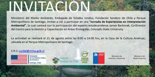 El Ministerio del Medio Ambiente de Chile, la Embajada de Estados Unidos en Chile, la Fundación Sendero de Chile y el Parque Metropolitano de Santiago invitan a participar en una “Jornada de Experiencias en Interpretación Ambiental” a realizarse el 21 de agosto de 9am a 2pm, en la Casa de la Cultura Anahuac, ubicada en el Parque Metropolitano de Santiago.
