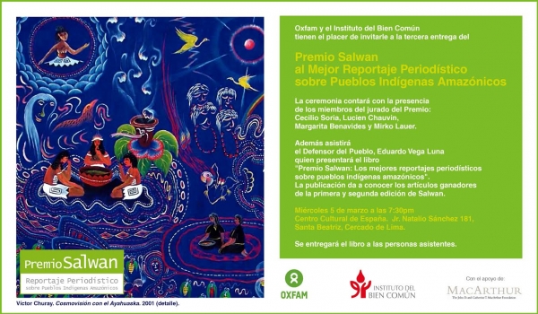Mañana por la noche se llevará a acabo la ceremonia de premiacion a los mejores reportajes periodísticos 2013 sobre pueblos indígenas amazónicos, que Oxfam y el Instituto del Bien Común (IBC) promueven desde el 2011.
