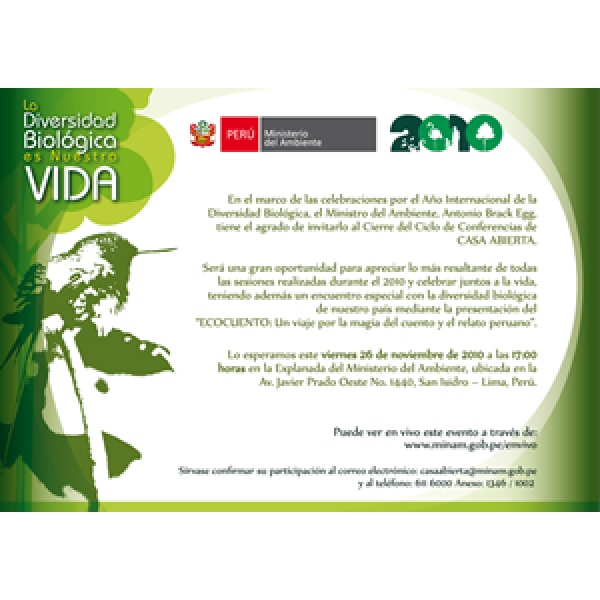 El cierre del ciclo de conferencias de Casa Abierta por el Año Internacional de la Biodiversidad 2010, organizado por el Ministerio del Ambiente (MINAM) del Perú, se realizará el viernes 26 de noviembre, a las 17:00 hrs., en la explanada del MINAM, y podrás seguirlo en vivo a través de su página web.