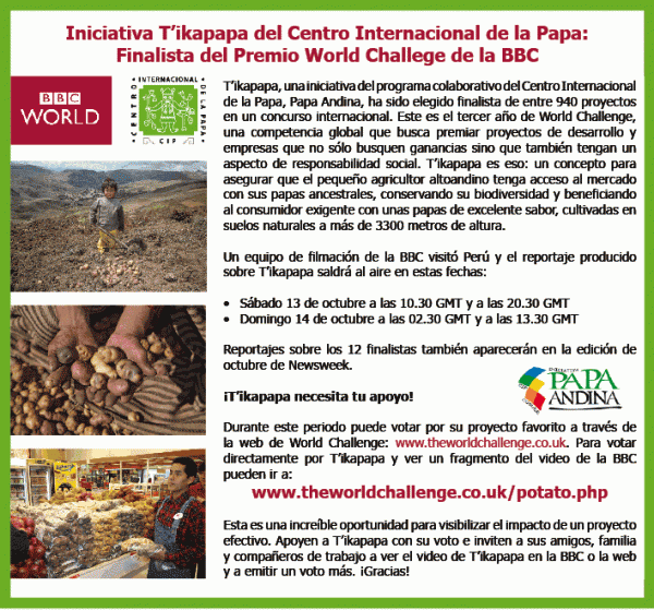 T’ikapapa, una iniciativa del programa colaborativo del Centro Internacional de la Papa, Papa Andina-Incopa, ha sido elegido finalista de entre 940 proyectos en un concurso internacional. Este es el tercer año de World Challenge, una competencia global que busca premiar proyectos de desarrollo y empresas que no sólo busquen ganancias sino que también tengan un aspecto de responsabilidad social. T’ikapapa es eso: un concepto para asegurar que el pequeño agricultor altoandino tenga acceso al mercado con sus papas ancestrales, conservando su biodiversidad y beneficiando al consumidor exigente con unas papas de excelente sabor, cultivadas en suelos naturales a más de 3300 metros de altura.