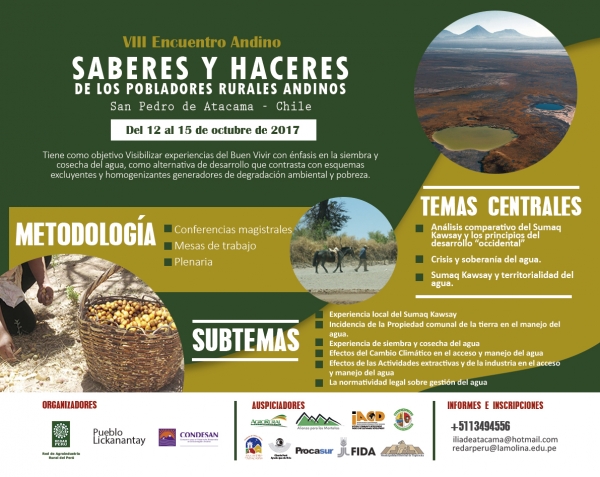 Por octavo año consecutivo, la Red de Agroindustria Rural del Perú (REDAR) junto al pueblo Lickanantay de San Pedro de Atacama, el Consorcio para el Desarrollo Sostenible de la Ecorregión Andina (Condesan) y La Red Andina de Saberes y Haceres, organizan el Encuentro Internacional “Saberes y Haceres de los Pobladores Rurales Andinos” que se llevará a cabo del 12 al 15 de octubre en San Pedro de Atacama – Chile.