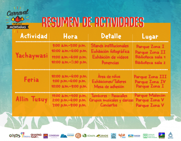 El Carnaval por las Montañas tiene como objetivo ser un puente de comunicación entre los que conocemos sobre nuestros andes con la población. Para ello, se tiene previsto la realización de talleres, charlas, conciertos, juegos y cine, entre otras actividades.